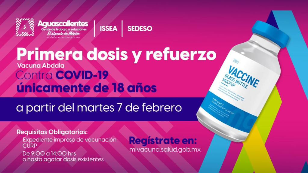 A partir del martes 7 de febrero inician las Jornadas de Vacunación contra el SARS-CoV-2 (covid-19) en los diferentes Centros de Salud del estado, de lunes a viernes de 9:00 a. m. a 2:00 p. m. Se aplicará la primera dosis y refuerzos de la vacuna Abdala, únicamente a personas de 18 años de edad en adelante.