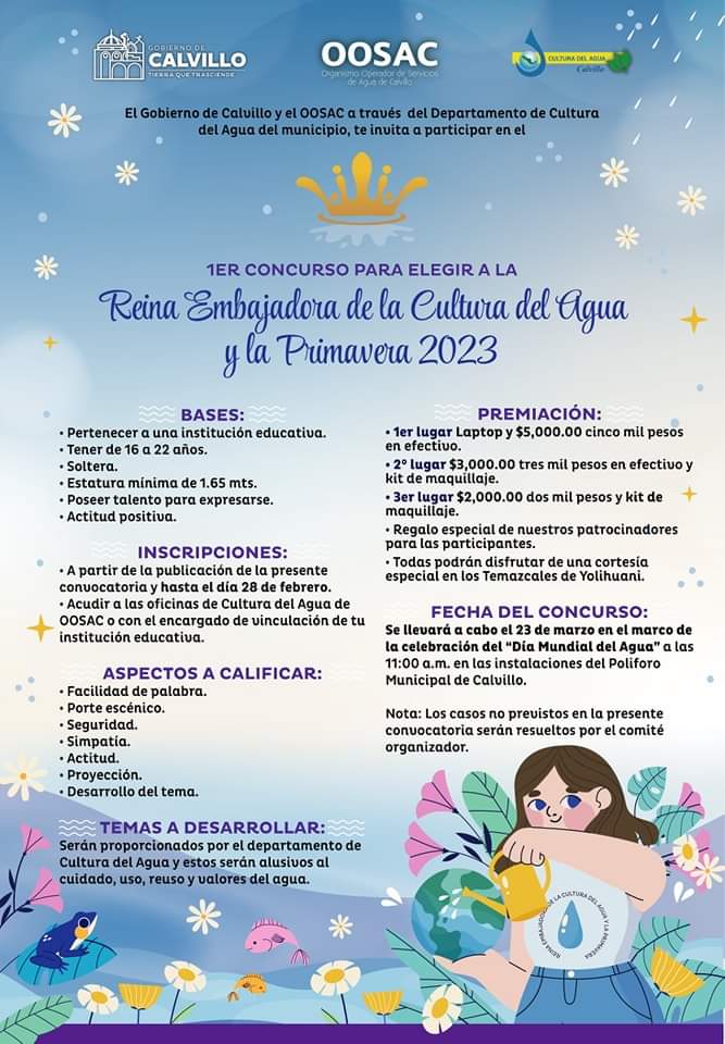 👸🏻💧𝑹𝒆𝒊𝒏𝒂 𝑬𝒎𝒃𝒂𝒋𝒂𝒅𝒐𝒓𝒂 𝒅𝒆 𝒍𝒂 𝑪𝒖𝒍𝒕𝒖𝒓𝒂 𝒅𝒆𝒍 𝑨𝒈𝒖𝒂 𝒚 𝒍𝒂 𝑷𝒓𝒊𝒎𝒂𝒗𝒆𝒓𝒂 𝟐𝟎𝟐𝟑 El Gobierno de Calvillo y el OOSAC, a través del departamento de Cultura del Agua invita a las jóvenes amigas del agua a participar en este concurso. ⬇️Revisa aquí la convocatoria: