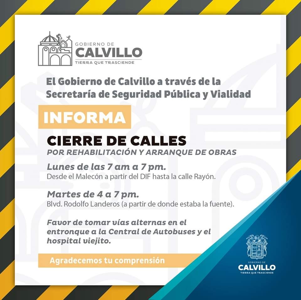⚠️𝗔𝗩𝗜𝗦𝗢 𝗜𝗠𝗣𝗢𝗥𝗧𝗔𝗡𝗧𝗘: 𝘾𝙞𝙚𝙧𝙧𝙚 𝙙𝙚 𝙘𝙖𝙡𝙡𝙚𝙨⚠️ Debido a la rehabilitación y arranque de obras este lunes y martes se cerrarán las siguientes calles: Agradecemos tu comprensión. Tierra Que Trasciende