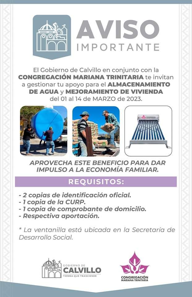 Del 01 al 14 de marzo te invitamos a gestionar tu apoyo para el almacenamiento de agua y mejoramiento de vivienda a través de la ventanilla de la Congregación Mariana Trinitaria.