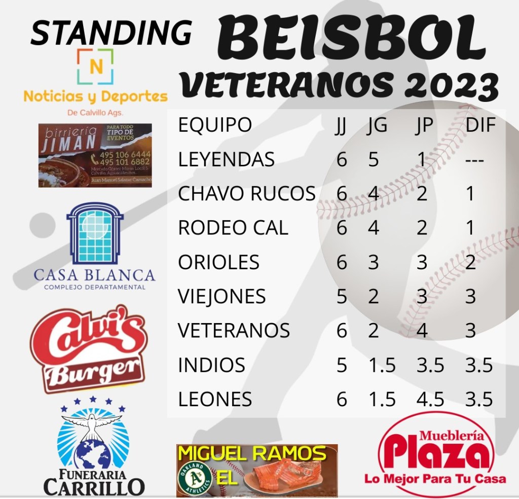 Liga Municipal de Beisbol de Calvillo te presenta rol y standing de la categoría de Veteranos, hasta la fecha 6. Aquí y en exclusiva y antes que nadie… #NoticiasyDeportes