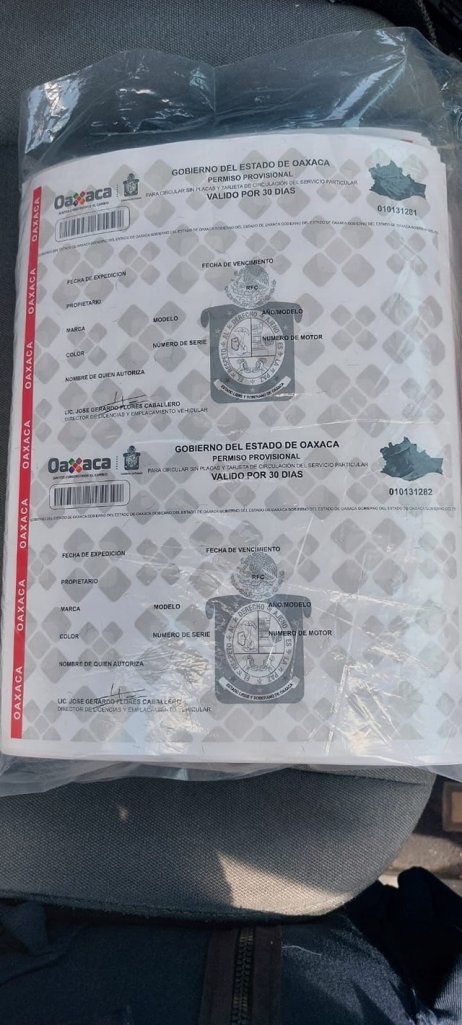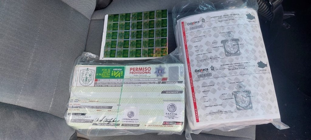 Fue así que detectaron dentro de la Cheyenne, 900 permisos para circular sin placas los cuales eran apócrifos, mismos que presuntamente eran expedidos por autoridades del municipio de Villa de Arriga, San Luis Potosí, así como del Estado de Oaxaca.