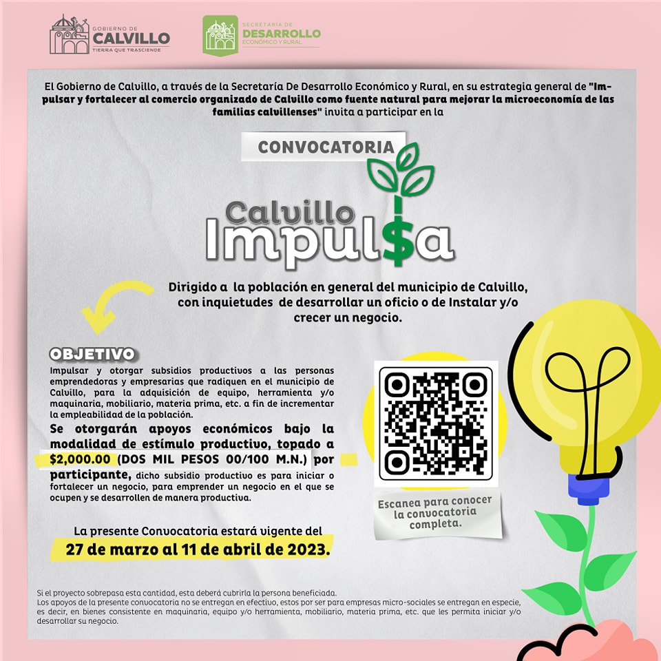 Con el objetivo de impulsar el desarrollo de oficios, negocios o emprendimientos, el Gobierno de Calvillo, a través de la Secretaría de Desarrollo Económico y Rural lanzan la convocatoria #CalvilloImpulsa: