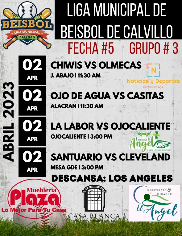Se da a conocer el rol de juegos de la fecha # 5 de la Liga Municipal de Beisbol de Calvillo, en su 2da y 3ra fuerza… Aquí conocerás el rol completo, de los diferentes grupos. #NoticiasyDeportes