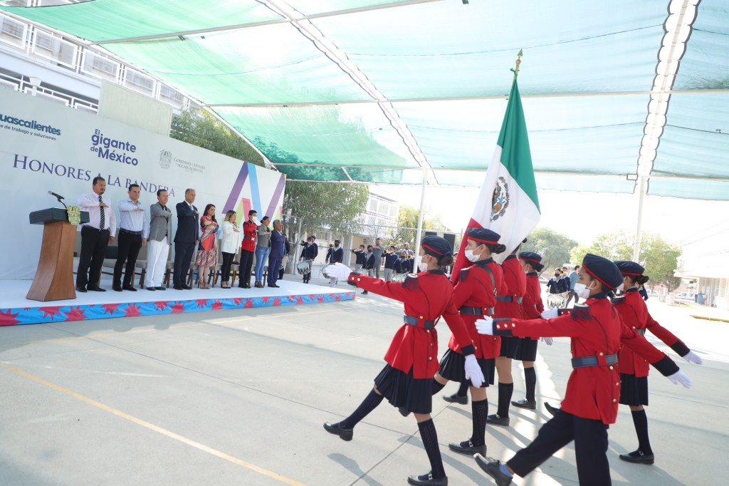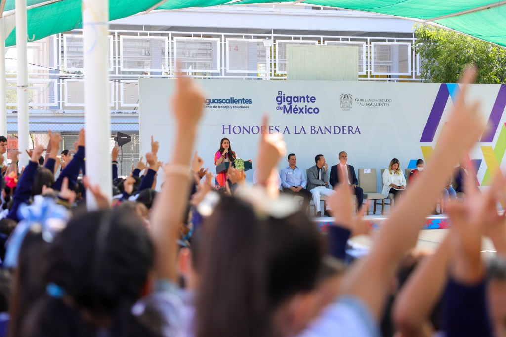 La gobernadora de Aguascalientes, Tere Jiménez, encabezó la ceremonia de Honores a la Bandera en la Escuela Primaria “Macuilxochitzin” del municipio de Jesús María, donde puso en marcha el programa Patrulla Ambiental, que tiene como objetivo fomentar el cuidado del medio ambiente; además inauguró un laboratorio de cómputo en beneficio de más de 650 alumnos.
