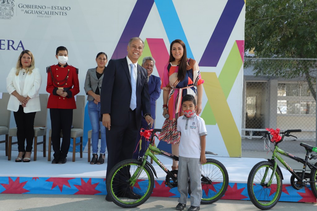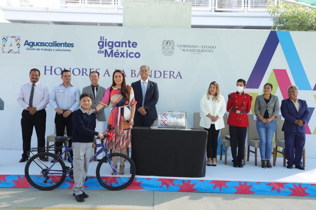 En el marco del acto cívico, la gobernadora entregó reconocimientos, tabletas y bicicletas a las y los alumnos con mejores promedios.