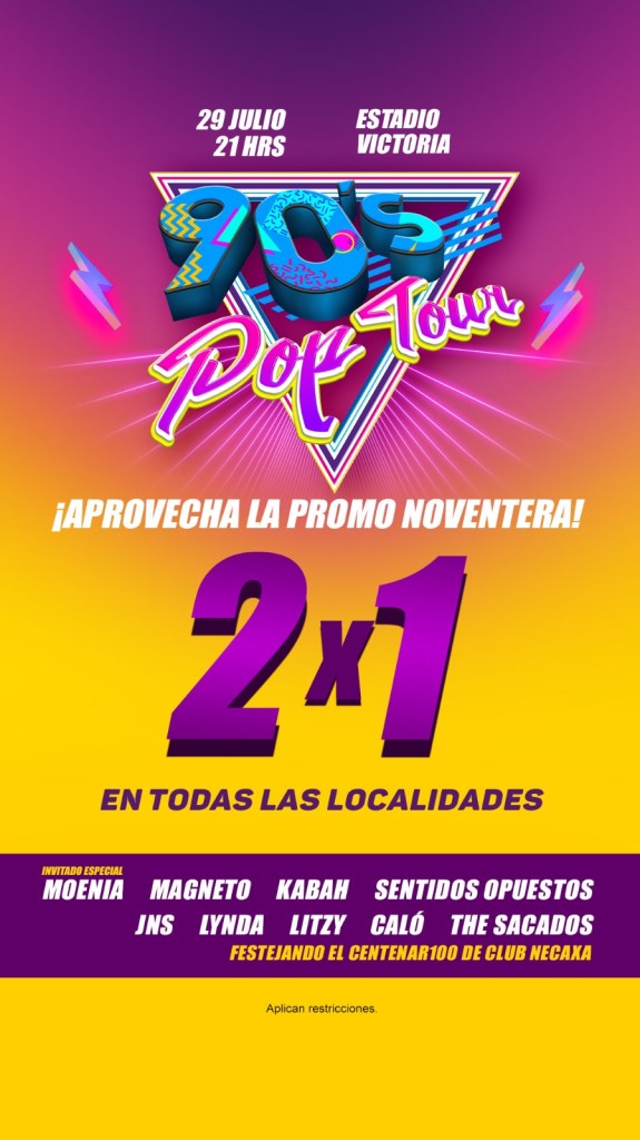Los boletos ya están a la venta en boletomóvil en la página https://boletomovil.com/evento/90s-pop-tour-2023-07-29/recinto?promoCode=2X1%2090%20Pop%20Tour.