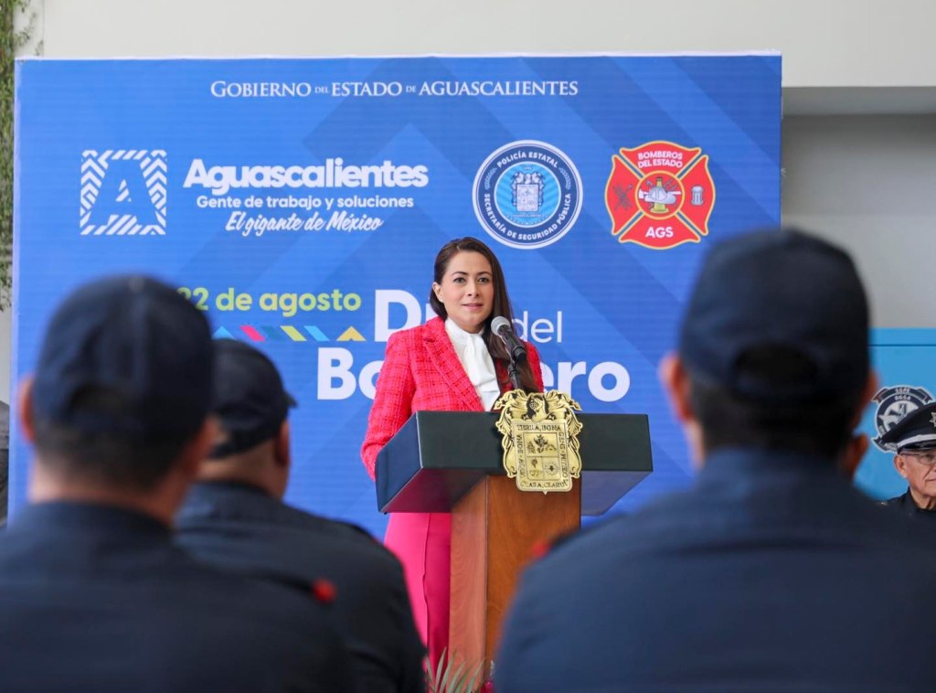 La gobernadora de Aguascalientes, Tere Jiménez, reconoció la importante labor que realizan los bomberos, al presidir la ceremonia en conmemoración a esta noble profesión.