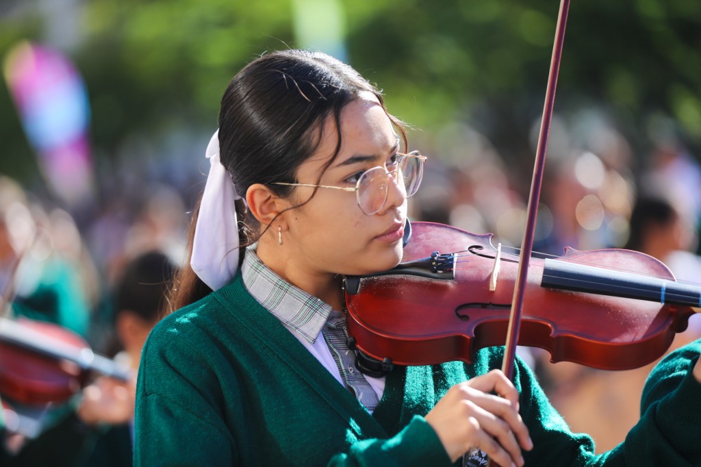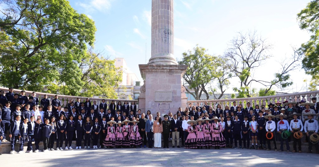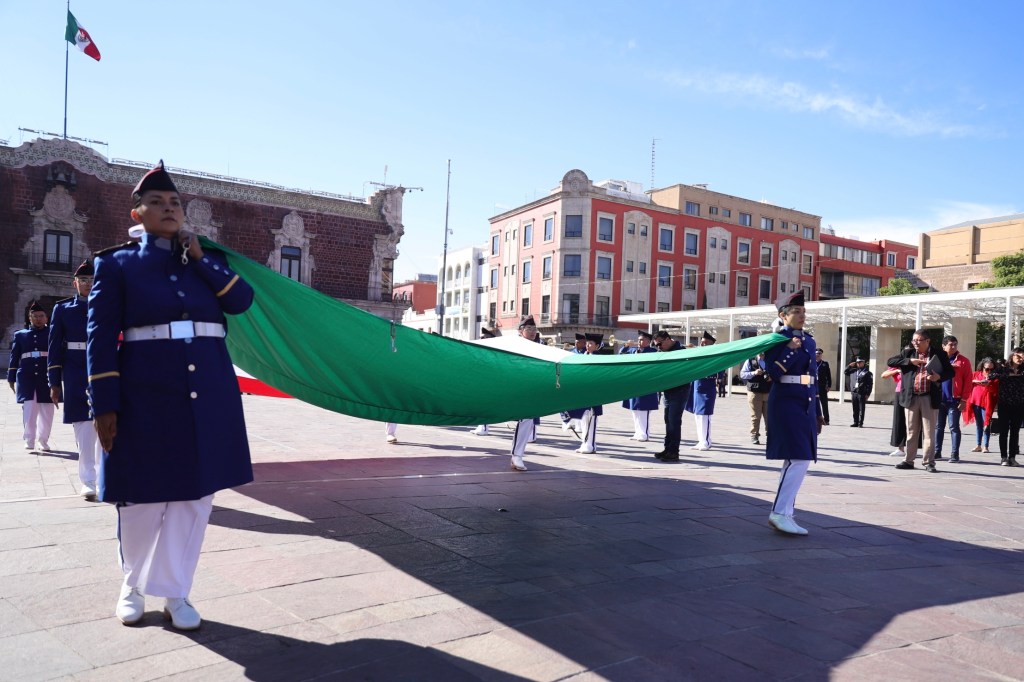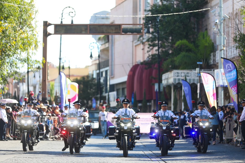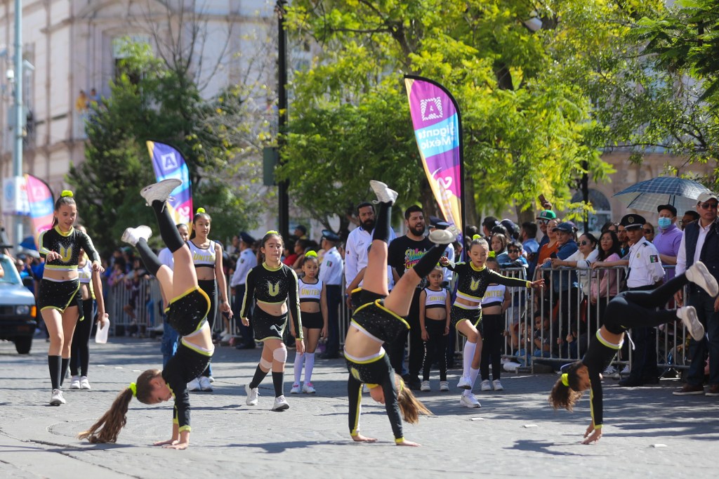 Previamente, la gobernadora del estado encabezó los honores a la Bandera en la Plaza Patria acompañada por autoridades civiles y militares, para luego trasladarse al templete oficial que se instaló en la calle Moctezuma, desde donde presenció el paso de los contingentes.