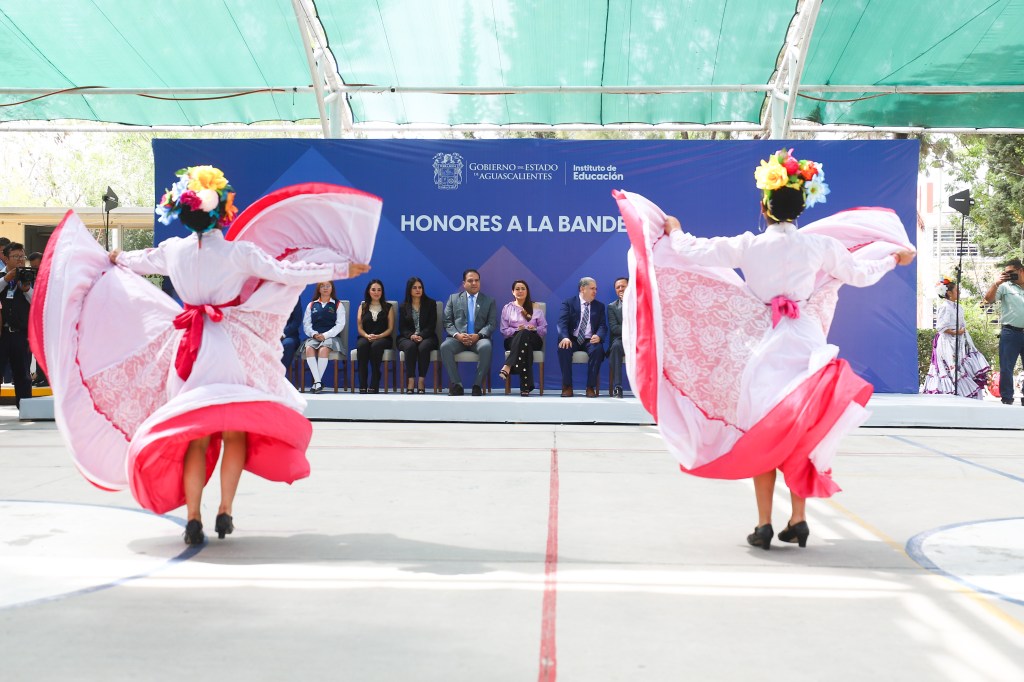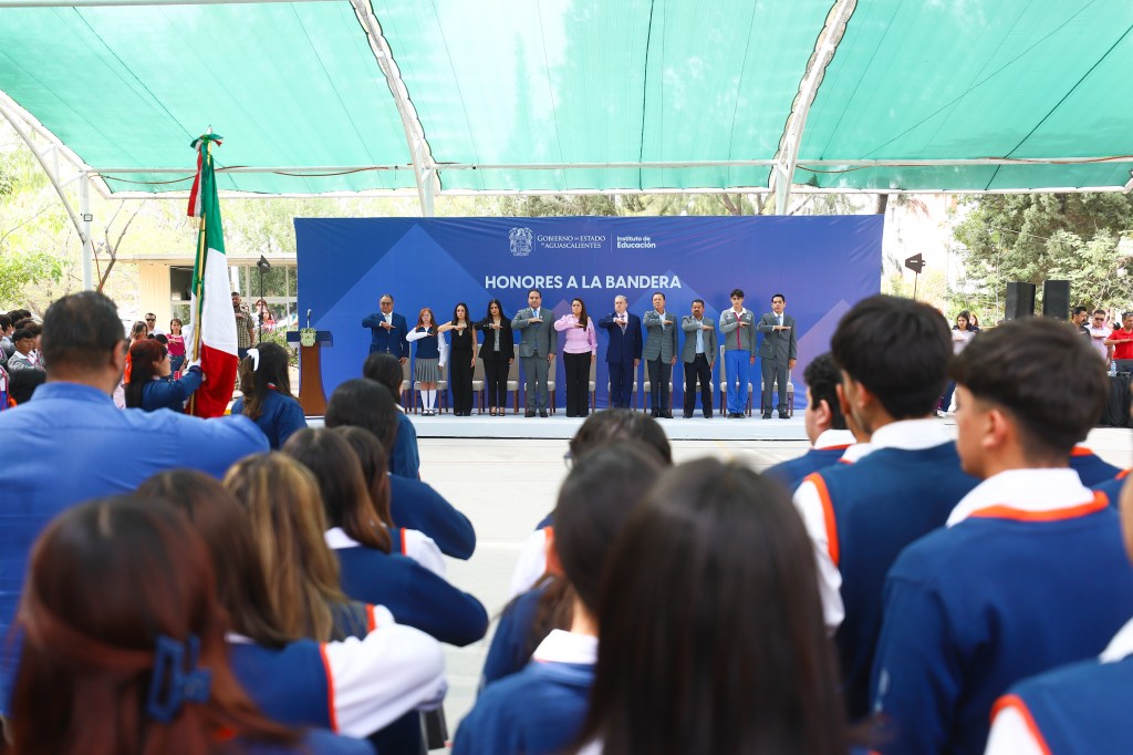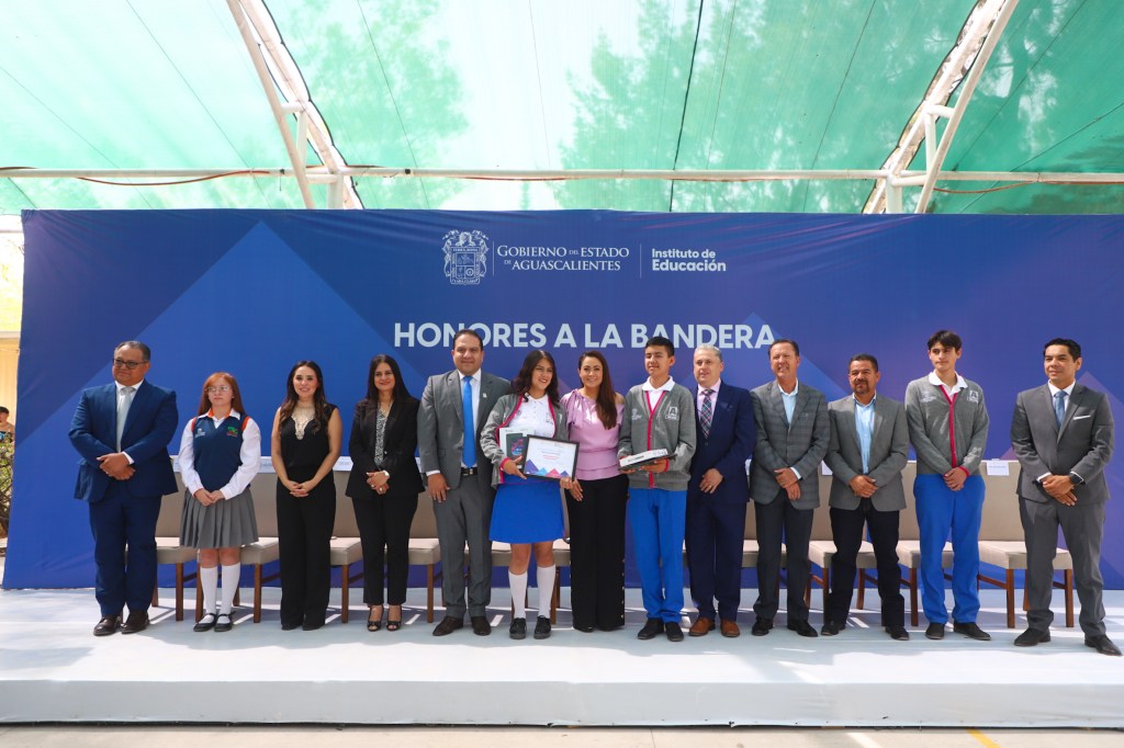 La gobernadora de Aguascalientes, Tere Jiménez, encabezó la ceremonia de Honores a la Bandera en el Colegio de Estudios Científicos y Tecnológicos del Estado de Aguascalientes (CECyTEA), plantel Ferrocarriles, donde entregó reconocimientos a los ganadores del Festival Académico Nacional de los CECyTEs 2024.