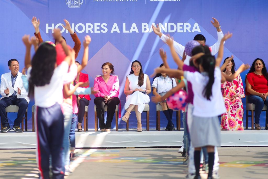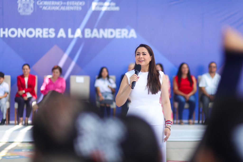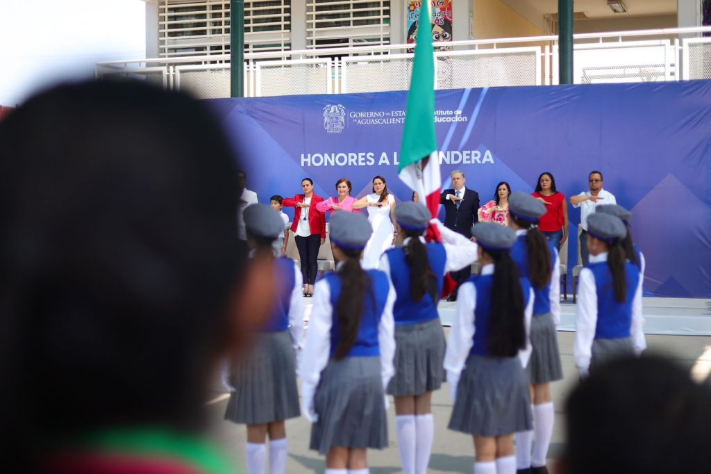 La gobernadora de Aguascalientes, Tere Jiménez, encabezó los Honores a la Bandera en la Escuela Primaria “Pablo Latapí Sarre”, en el fraccionamiento La Ribera del municipio de San Francisco de los Romo, donde tuvo la oportunidad de saludar a la comunidad educativa conformada por docentes, estudiantes, padres y madres de familia.