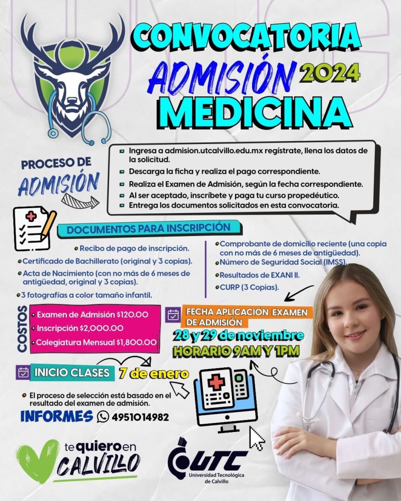 La gobernadora de Aguascalientes, Tere Jiménez, dio a conocer que ante la buena respuesta que ha recibido la carrera de medicina en la Universidad Tecnológica de Calvillo (UTC), a partir de enero de 2025 se abrirá un nuevo grupo.