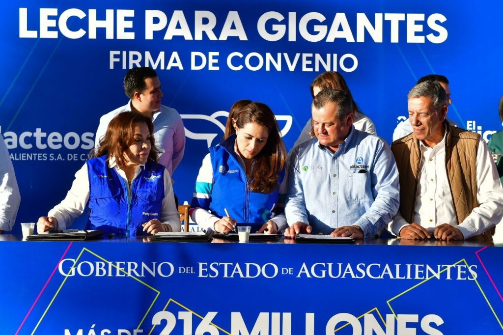 La gobernadora Tere Jiménez encabezó la firma del convenio para la producción de “Alileche, para los futuros gigantes”, con lo que se apoya a los lecheros para la venta de su producto y a las familias de Aguascalientes que ahora podrán adquirir leche de calidad a un precio accesible.